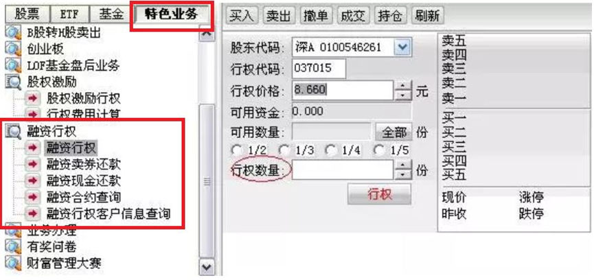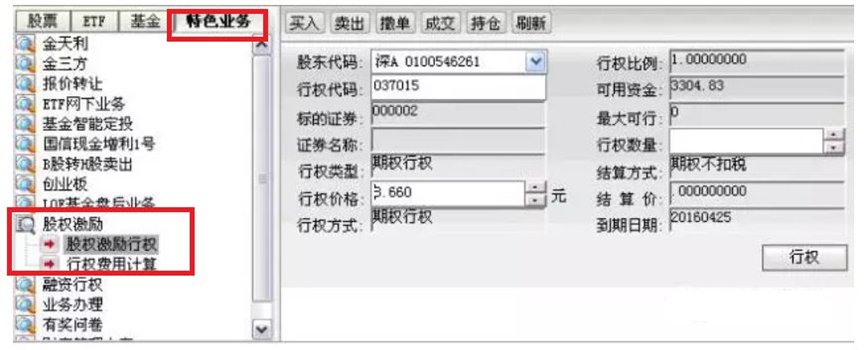 系统登录成功,进入交易界面,点击【特色业务】菜单,点击【股权激励行权】进入行权界面,输入行权代码。