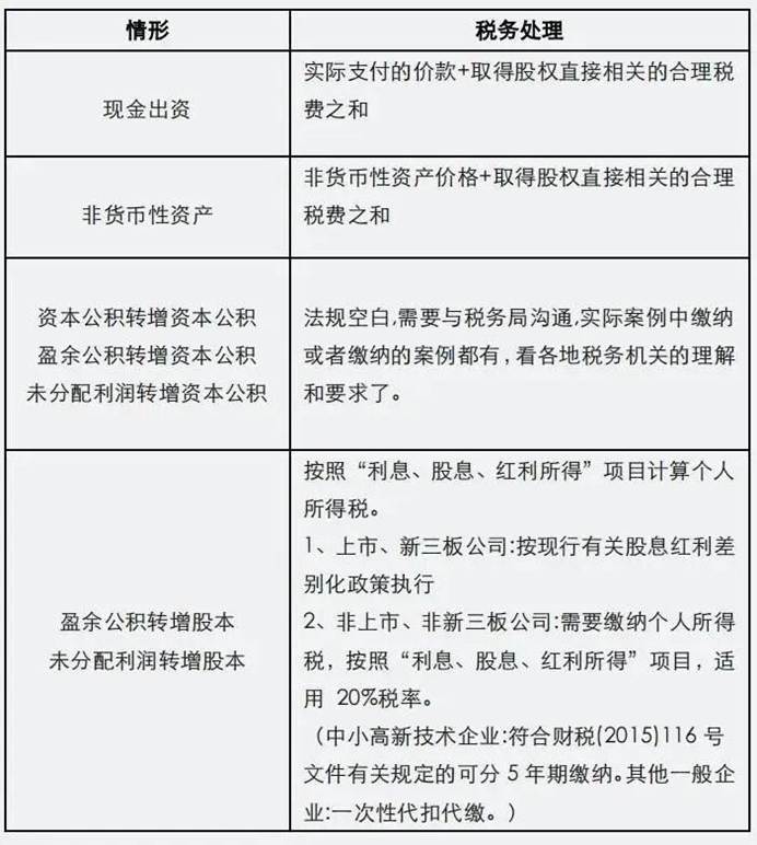 被投资企业以除“溢价”外的资本公积、盈余公积、未分配利润转增股本,应视同被投资企业先向股东进行分红,股东再以分红向被投资企业追加投资。此时,股东应就转增额按照“利息、股息、红利所得”计算缴纳个人所得税,并以转增额和相关税费之和确认其新转增股本的股权原值。