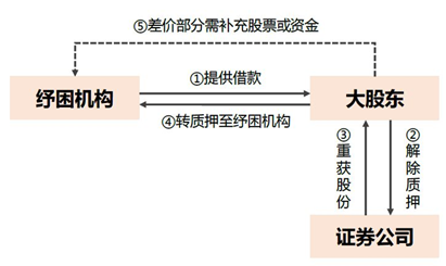 例如,假设股票价格为10元,假设质押率为40%,预定利率为8%,质押一亿股。大股东质押给证券公司获得4亿元,到期连本带息还给证券公司4.32亿元。假设预警线为150%、平仓线为130%。如果股价下跌到6.48元(4*(1+8%)*150%)将触及预警线,如果股价下跌到5.6元(4*(1+8%)*130%)将触及平仓线。在“转质押”模式下,预警线与平仓线将降低。假设股价下跌至6.48元,股票质押达到150%的预警线。纾困基金借给大股东4.32亿元解除质押,而同时大股东赎回价值6.48亿元的股票。大股东再将一亿股以40%的质押率质押给其他证券公司,拿回2.59亿元(6.48*40%),与借的4.32亿元仍差1.73亿元。因此这1.73亿元的差价部分由大股东补充,或者可增加价值为4.33亿元(1.73/40%)的股票。在“转质押”模式下,大股东经过再次质押,股价基准已降低,预警线与平仓线降低。在此案例中,如果依然假设利率为8%、预警线为150%、平仓线为130%,那么上市公司股价跌至4.20元(2.59*(1+8%)*150%)才达到预警线,下降到3.64元(2.59*(1+8%)*130%)才达到平仓线。