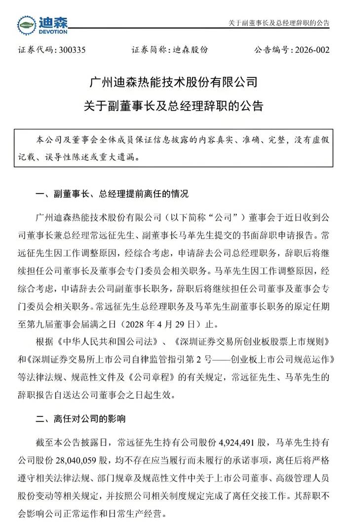 据迪森股份2月6日公告,马革因工作调整原因,经综合考虑,申请辞去公司副董事长职务,辞职后将继续担任公司董事及董事会专门委员会相关职务。
