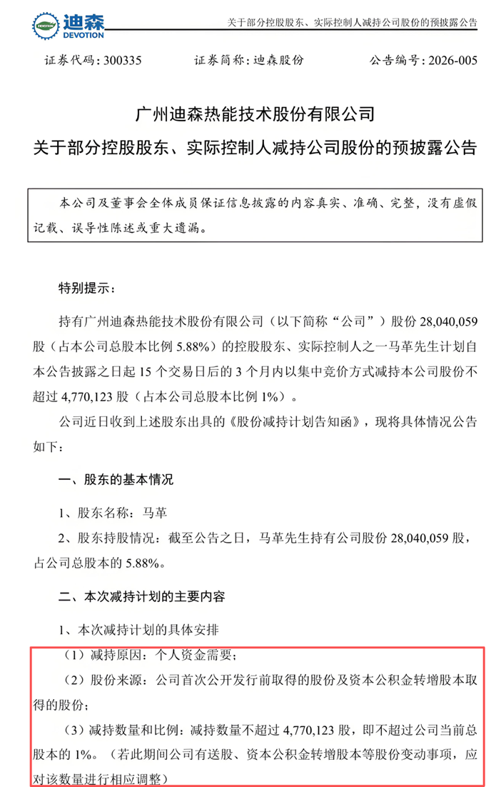 迪森股份表示,马革减持原因为个人资金需要,其将根据市场情况、公司股价情况等具体情形决定是否实施本次股份减持计划。本次减持计划存在减持时间、数量、价格的不确定性,也存在是否按期实施完成的不确定性。