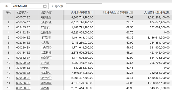 质押股份占总市值比重超过50%的则有14家。海德股份、国城矿业最多,分别达到75.09%和70.15%。