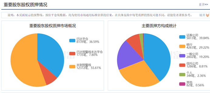 根据东方财富估算,按照笔数来算,在股票质押市场,目前重要股东达平仓占比为36.59%,已达预警未达平仓占比为7.80%,未达预警线占比为55.61%。