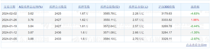 东方财富援引中登公司最新数据显示,截至2月2日,A股质押公司数量为2425家,质押笔数为1.67万笔,质押总股数为2.28万亿元,质押总比例为3.62%。与1月26日相比,股票质押公司家数、市值均出现下滑。