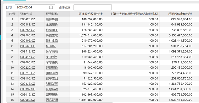 Wind资讯统计数据显示,截至2月2日,第一大股东质押比例超过80%的A股上市公司共有203家。其中累计质押占持股比例100%,即全部质押的有59家。
