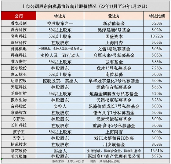 自2023年11月以来,上市公司协议转让公告明显增多。据界面新闻记者不完全统计,2023年11月至今年1月19日,仅沪深两市已有近百家上市公司发布协议转让公告。此外,还有至少15家科创上市公司发布了询价转让公告。