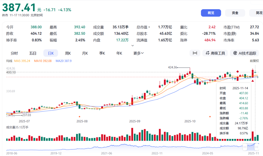 11月17日开盘,宁德时代A股低开近4%,盘中一度跌超4%,H股低开超2%。截至10点15分,A股股价报391.98元,下跌3%,市值较上周五收盘已蒸发超1000亿元。