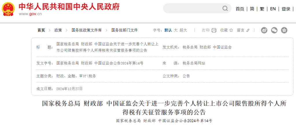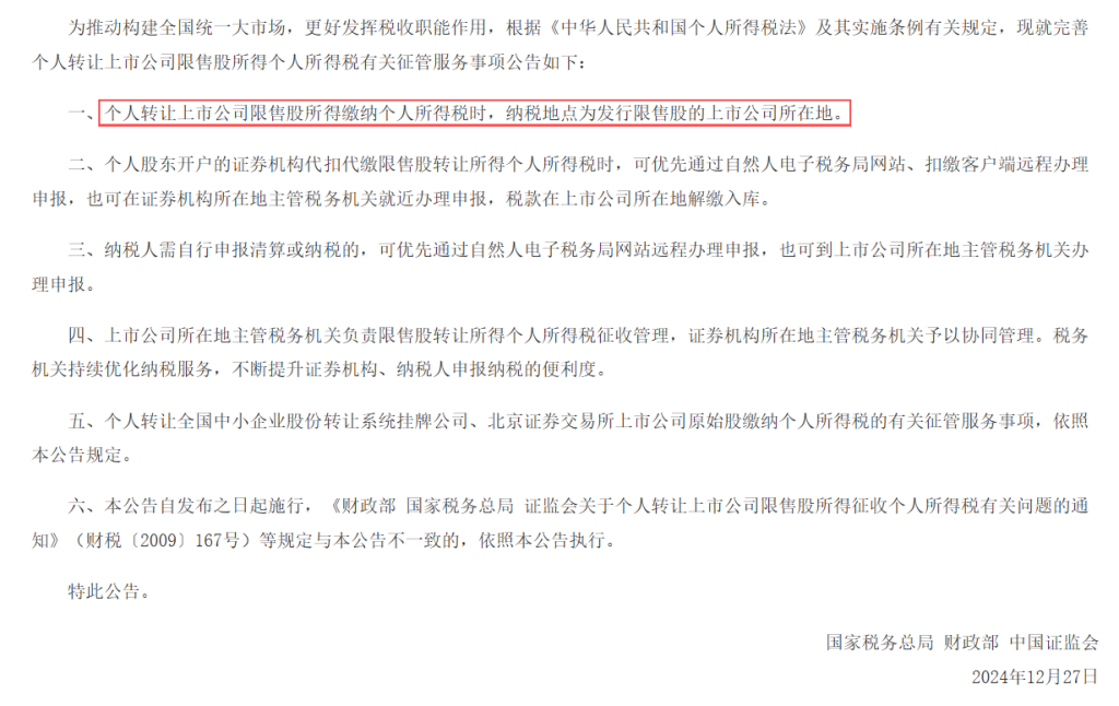 直到,2024年12月27日收盘之后,国家税务总局,财政部,中国证监会三部门联合发布了一则公告《关于进一步完善个人转让上市公司限售股所得个人所得税有关征管服务事项的公告》。