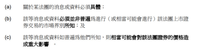 根据香港《证券及期货条例》,“内幕消息”就某上市法团而言,指符合以下说明的具体消息或资料——