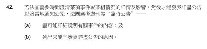 如上市公司需要时间澄清某项事项的详情及影响,然后才能发表详尽公告以适当地通知公众,应考虑刊发“临时公告”。该公告应尽可能详细说明有关事件的内容,列出未能刊发更详尽公告的原因。发出临时公告后,上市公司应在合理地切实可行的范围内尽快刊发详尽公告。
